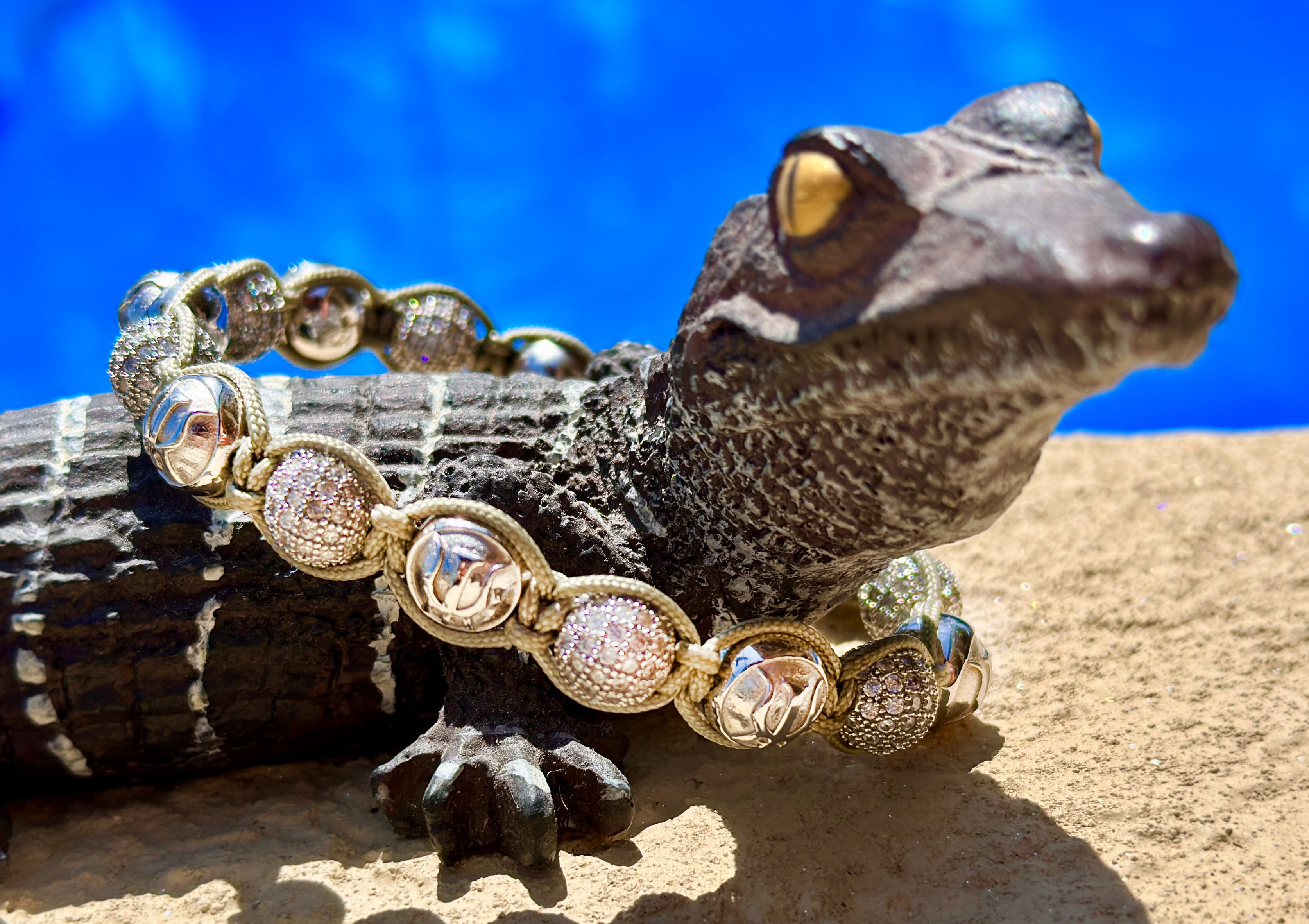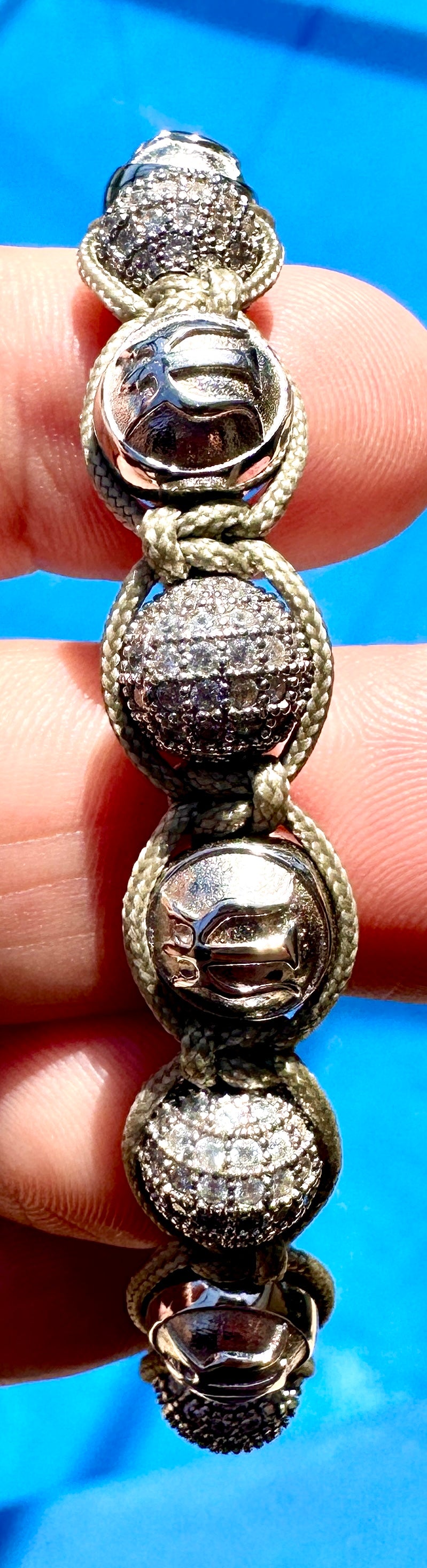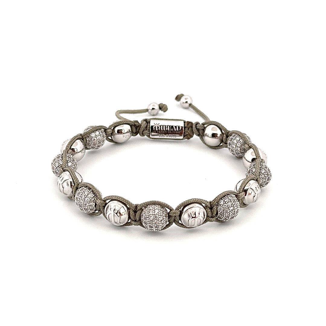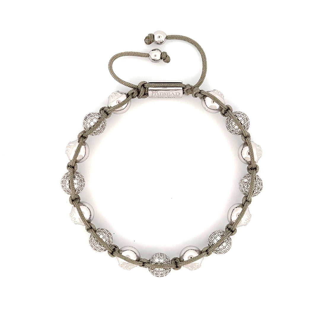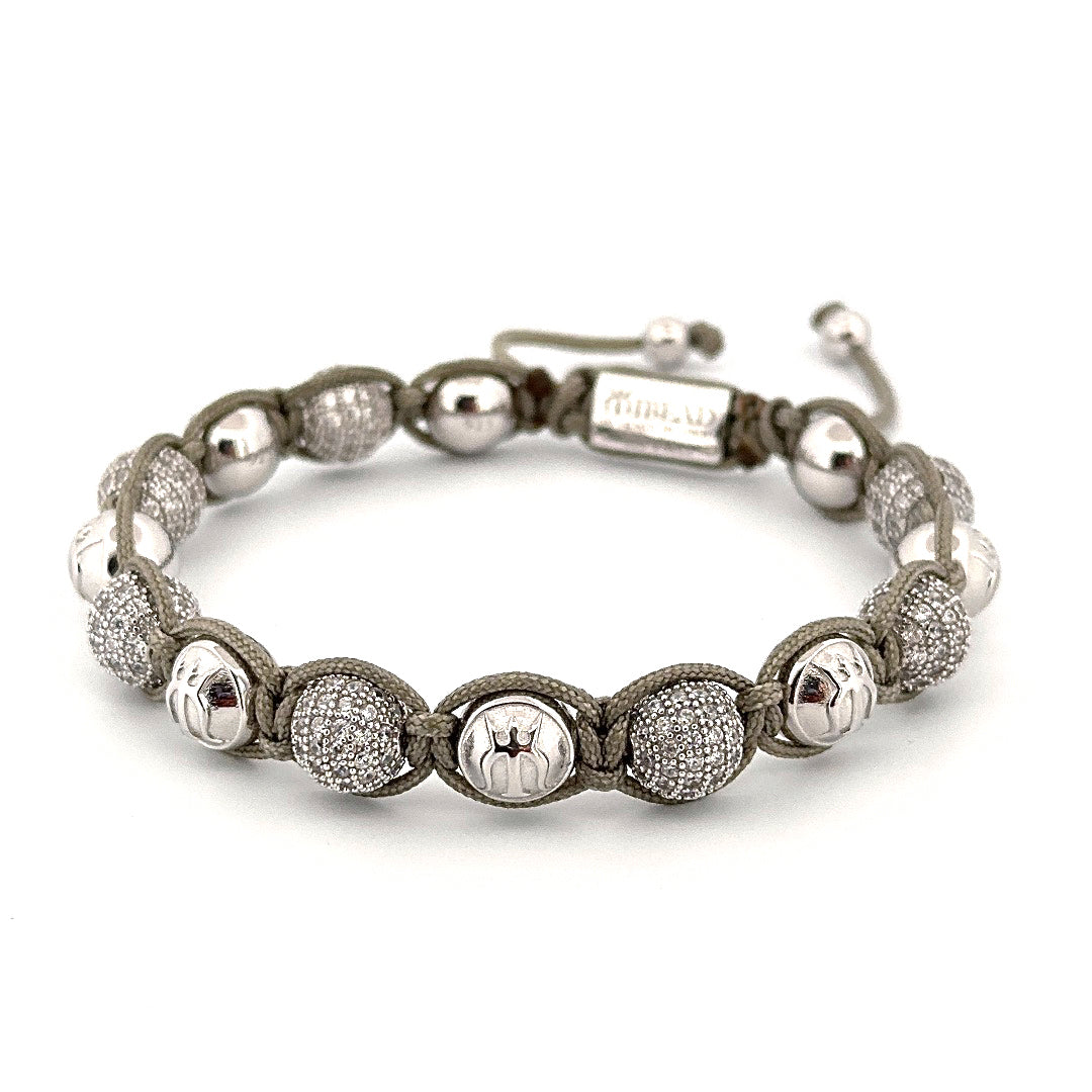 In Handarbeit, von unseren erfahrenen Schmuckherstellern, unter Verwendung einer speziellen Makramee-Technik gefädelt, ist dieses Stück schwer, maskulin und elegant. Die Kombination von massiven, silbernen Logoperlen und den Silberperlen mit Kristall-Brillanten schaffen ein beeindruckendes und luxeriöses Bild. Tragen Sie es solo oder kombiniert mit einem unserer schwarzen Schmuckstücke.
